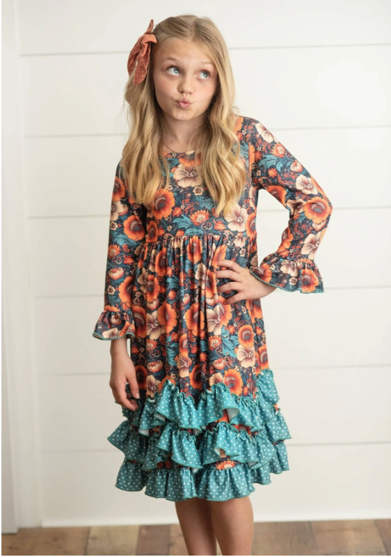 From our boutique collection — where style meets comfort! This beautiful dress is perfect for little ones who love to twirl and feel cozy at the same time. Featuring a chic rust and dark teal floral print, it’s finished with an adorable triple ruffle hem and made from soft, stretchy fabric to keep her comfy all day long.