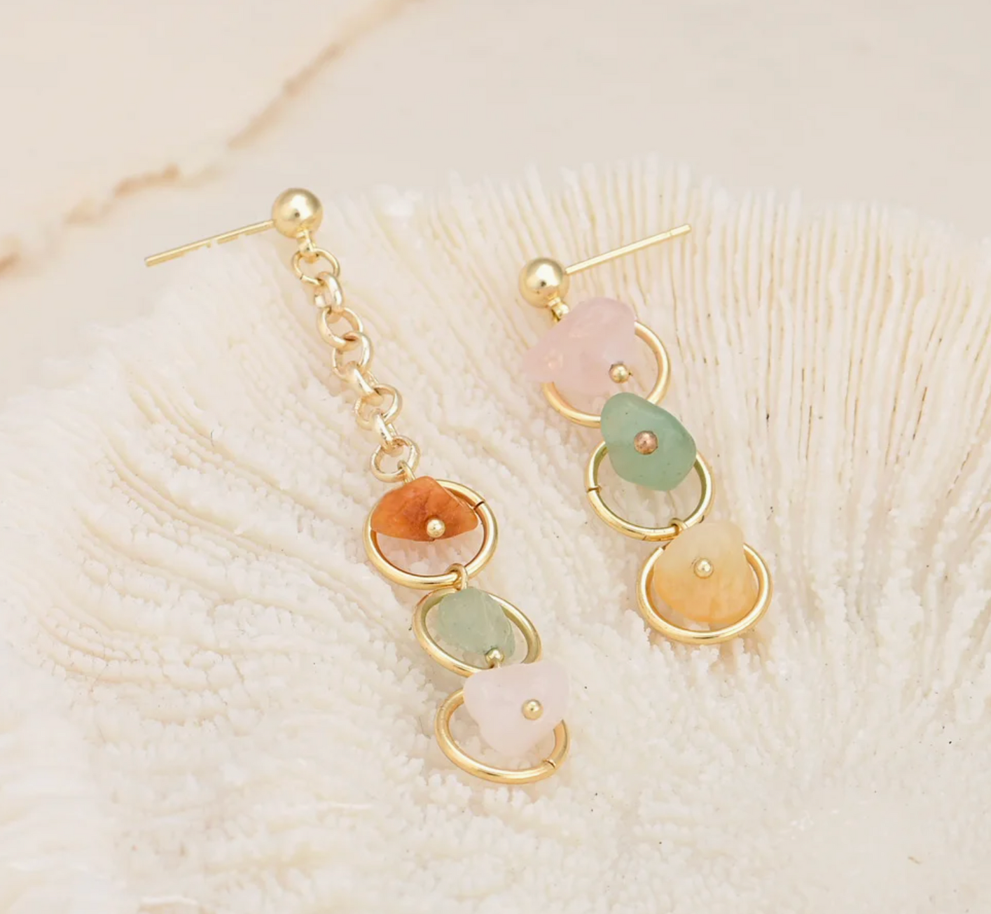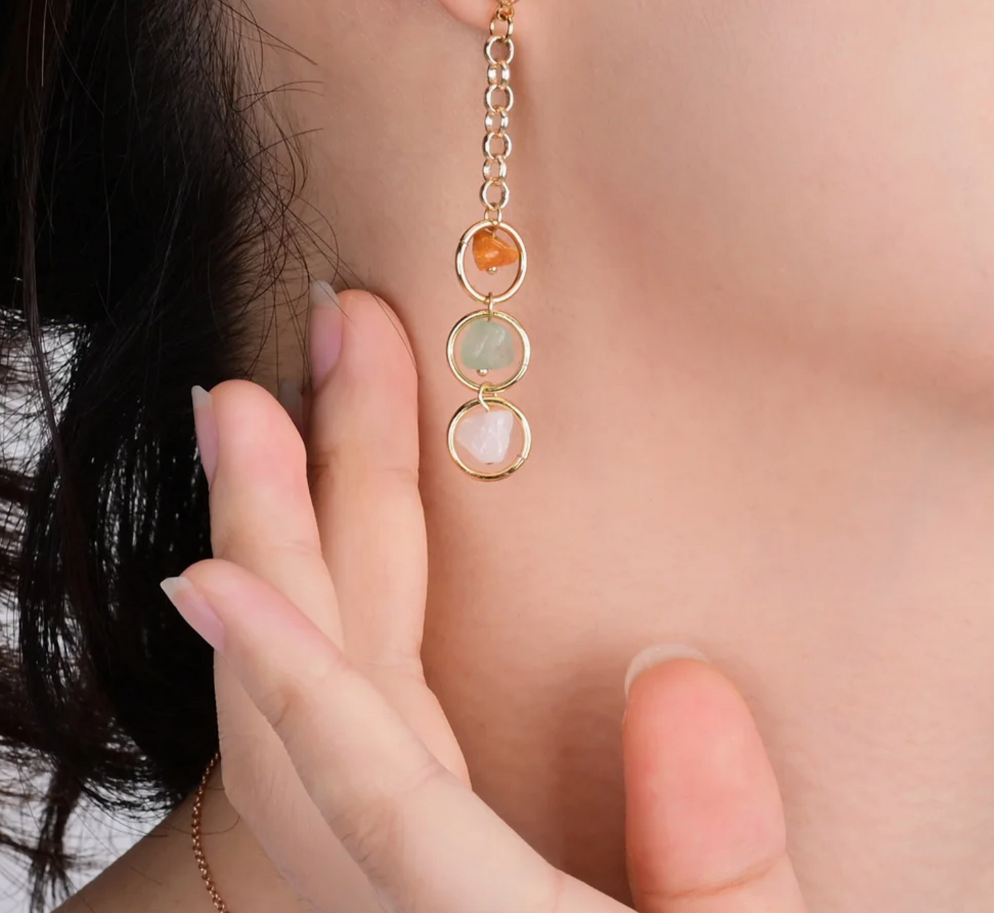 Add a playful touch to your style with our Vibrant Mixed Stone Mismatched Earrings. Crafted from an eclectic blend of mixed stones, each piece is unique, with colors that may vary, ensuring no two pairs are exactly alike. The earrings feature durable zinc alloy metal components, offering a sophisticated finish. This set includes one short earring and one long earring, creating a chic, asymmetrical look that stands out. Handmade with love and meticulous attention to detail, these earrings are more than just accessories—they are pieces of art. Elevate your jewelry collection with these carefully manufactured, vibrant mismatched earrings.